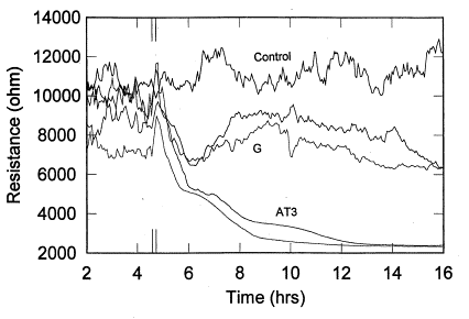 上圖分別是加入G細(xì)胞、AT3細(xì)胞和對(duì)照的內(nèi)皮細(xì)胞層阻抗曲線。可以看到隨著腫瘤細(xì)胞的加入,內(nèi)皮細(xì)胞層阻抗值開始降低,并且AT3細(xì)胞引起的降低更加顯著,阻抗值降低的原因是由腫瘤細(xì)胞的侵入影響了完整的內(nèi)皮細(xì)胞層。